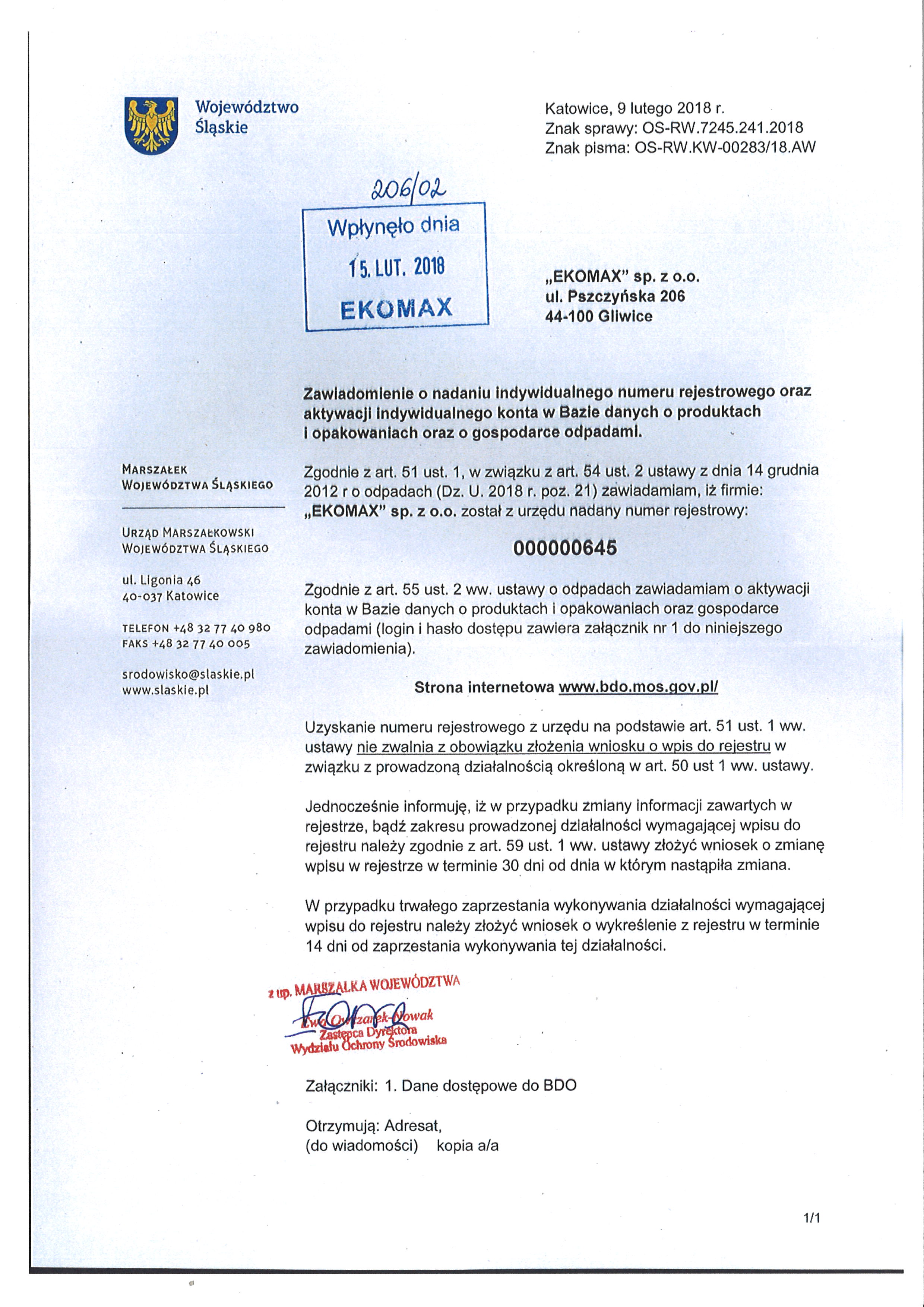 Zawiadomieniu o nadaniu numeru rejestrowego BDO